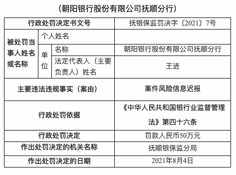 8月10日,抚顺银保监分局发布的行政处罚信息公开表显示,朝阳银行股份有限公司抚顺分行因案件风险信息迟报,被处罚款人民币50万元。王进、王大全对上述违规行为负有直接领导责任,均受到警告处分。