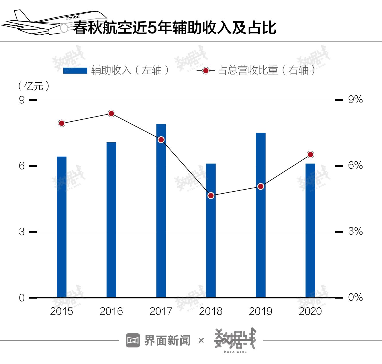 2020 年,春秋航空在航空出行衍生品、航空品牌类产品、航空流量衍生产品方面进行尝试。与首汽约车合作推出接送机产品、上线“一人多座产品”提高单客收入、直播销售公司飞机广告位,售价666万元......,上半年实现辅助收入2.9亿元;下半年,抓住随心飞带来的市场机遇,推出“想飞就飞15周年纪念礼包活动”,全年实现辅助收入6.1亿元。