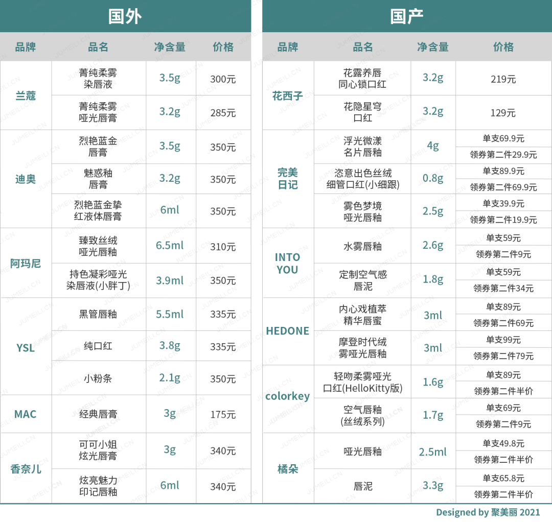 但记者查询市面上的国内外畅销口红单支容量后发现,国产口红特别是唇釉净含量相对来说较少。如colorkey的两款唇釉净含量分别1.6g和1.7g,同样的唇釉产品,国际品牌的净含量在5.5~6.5ml之间,几乎是它的三到四倍。