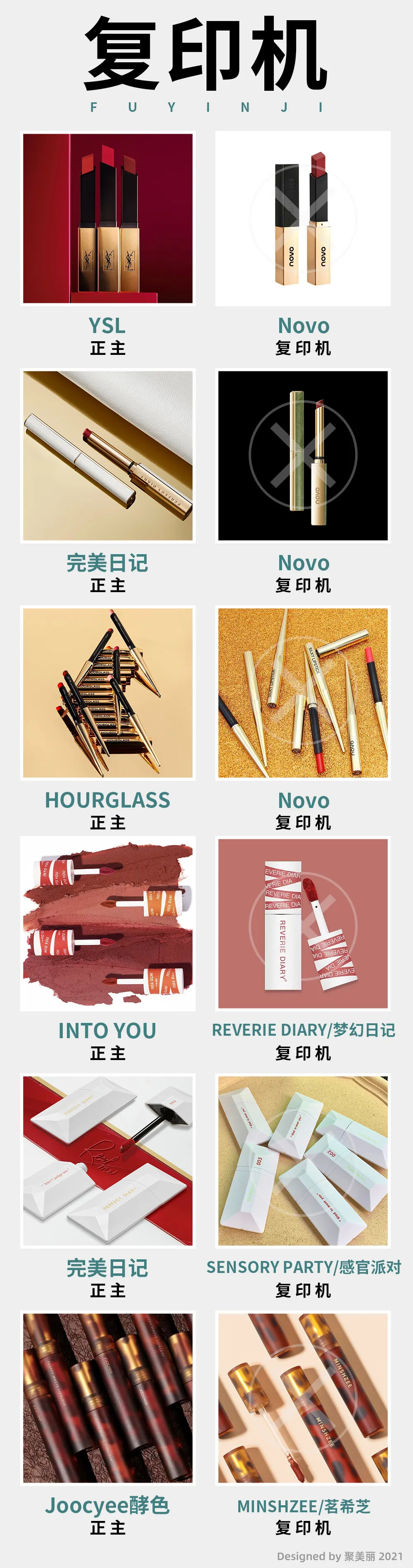 在各大品牌绞尽脑汁研发新产品、新色号想要赢得这场“内卷”之战时,也有部分品牌“另辟蹊径”,试图通过“复制”产品来快速获得成功。这里就不得不提到copy巨头novo,从YSL到HOURGLASS到完美日记,国内外各大品牌都是它“学习”的对象。