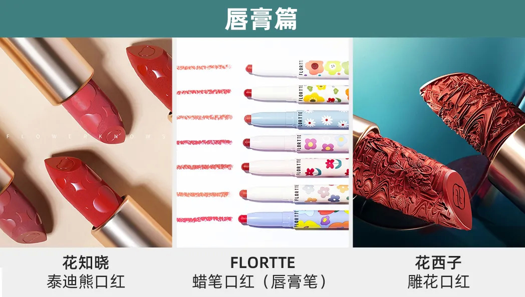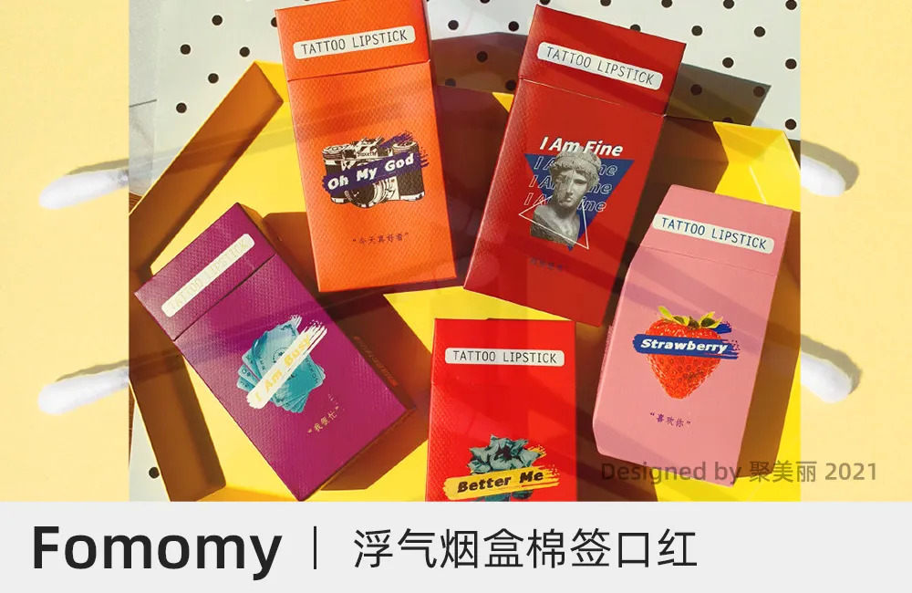 而在风格之外,一些品牌还会搭配概念,以改变外包装的形式来吸引消费者。比如,具有较高知名度的产品有花西子陶瓷口红、完美日记名片唇釉,以及浮气的烟盒棉签口红等等。