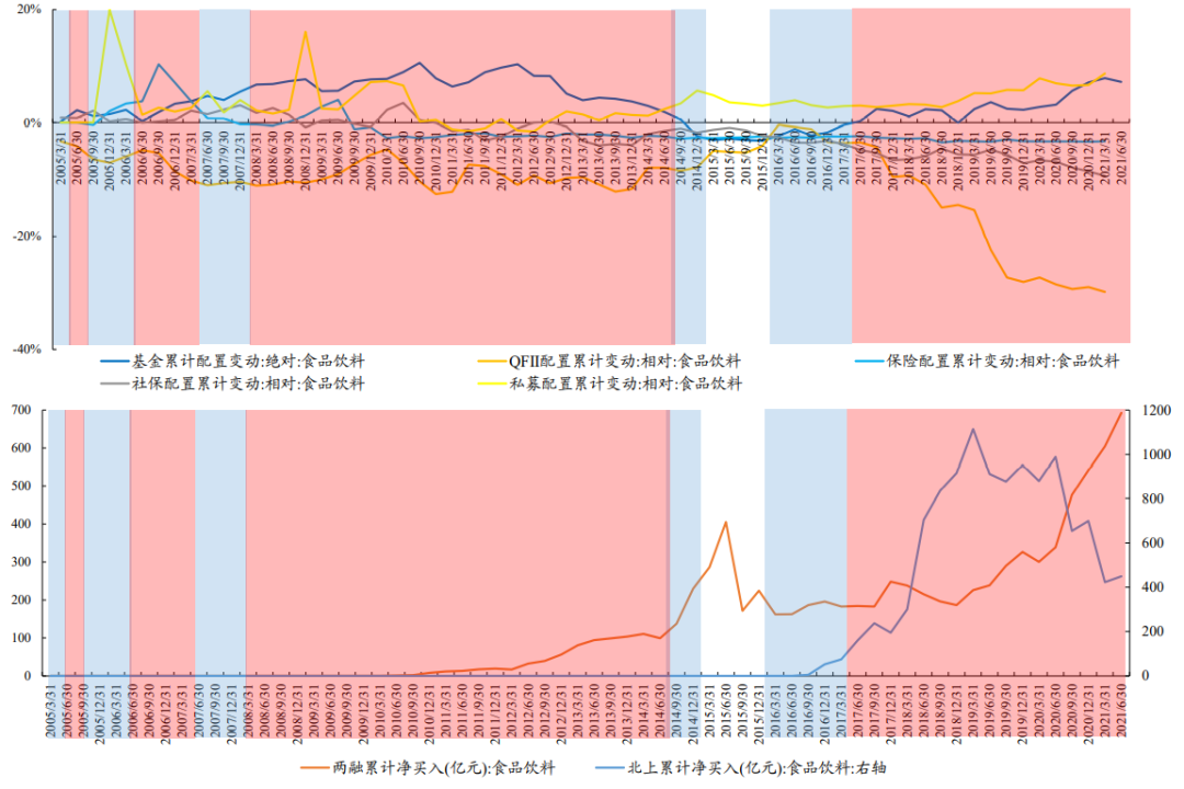 对于食品饮料板块,私募、QFII、北上等投资者的布局往往早于公募将其纳入自身前5大重仓行业,且退出时间一般早于公募,两融同样是在公募逐步减仓时完成最后的定价
