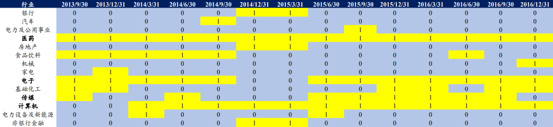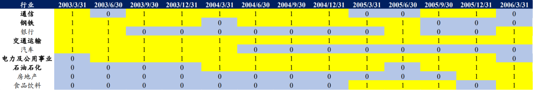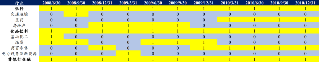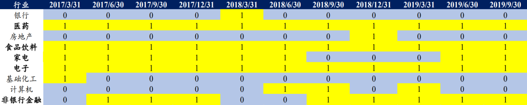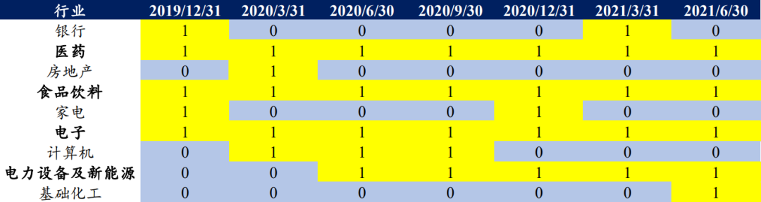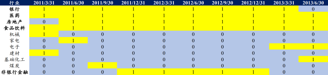 注:1、表中1表示为该行业在该时期入选了公募前5重仓行业,下同;2、底仓板块为所考察时期入选公募前5重仓行业的次数及连续入选次数均较多的行业。