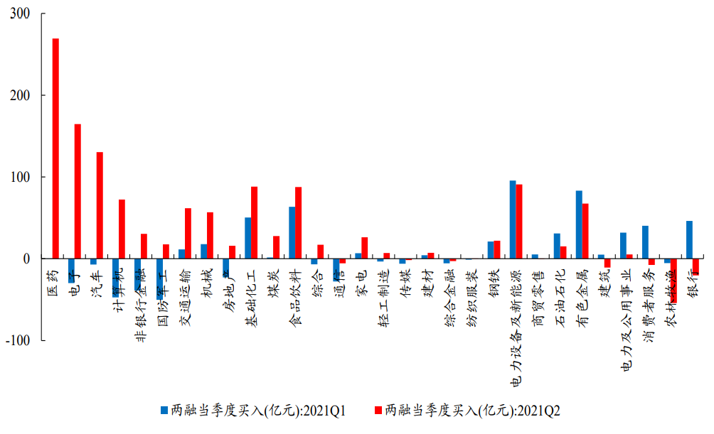2021Q2两融主要买入医药、电子、汽车、电新、化工、食品饮料、计算机、有色、交运、机械等板块