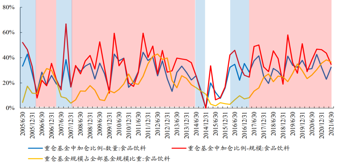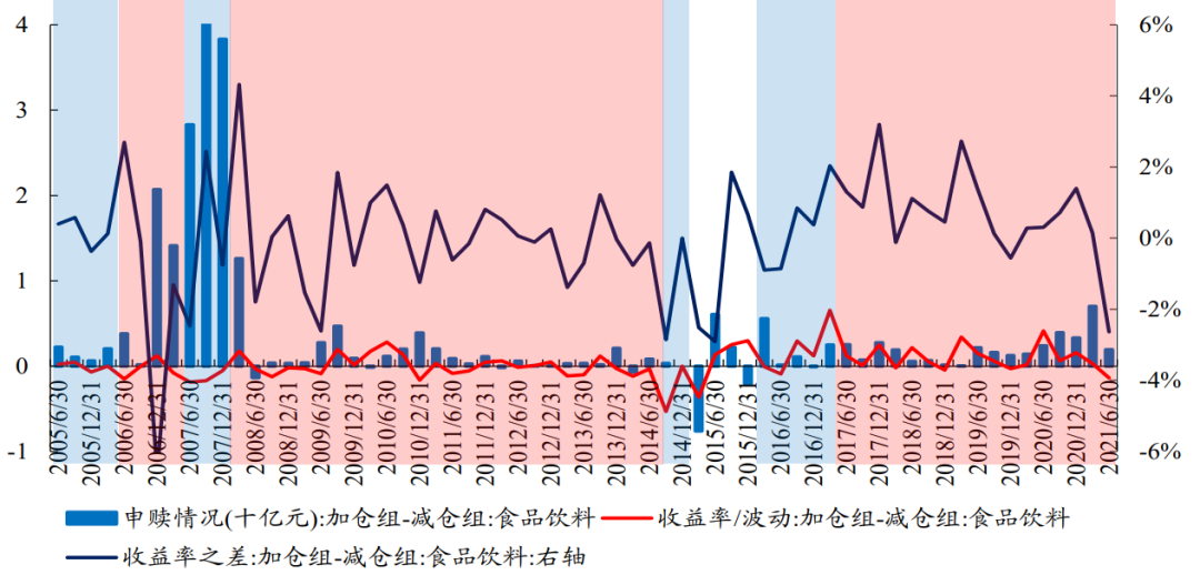对于食品饮料板块而言,在底仓的进入模糊期,以食品饮料为底仓行业且选择加仓的基金相较于以食品饮料为底仓行业且选择减仓的基金往往更能得到其负债端的青睐,而在退出模糊期则往往相反