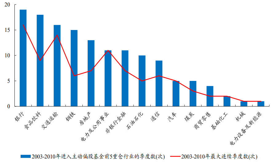 2003至2010年,入选主动偏股基金前5重仓行业最多的为银行、食品饮料、交运、钢铁、房地产、公用事业等板块,而连续入选次数最多的是银行、交运、电力及公用事业、食品饮料、房地产等板块