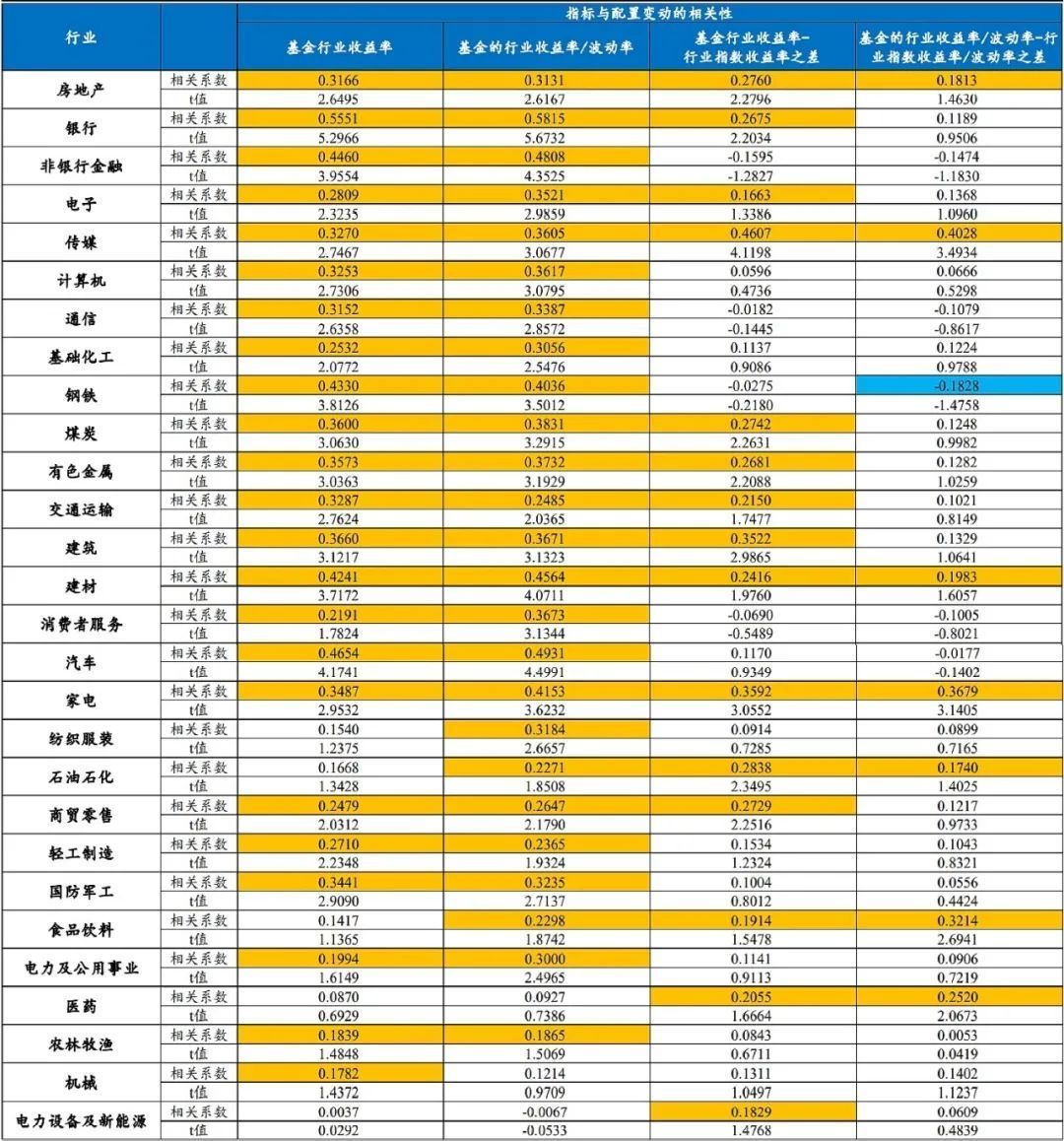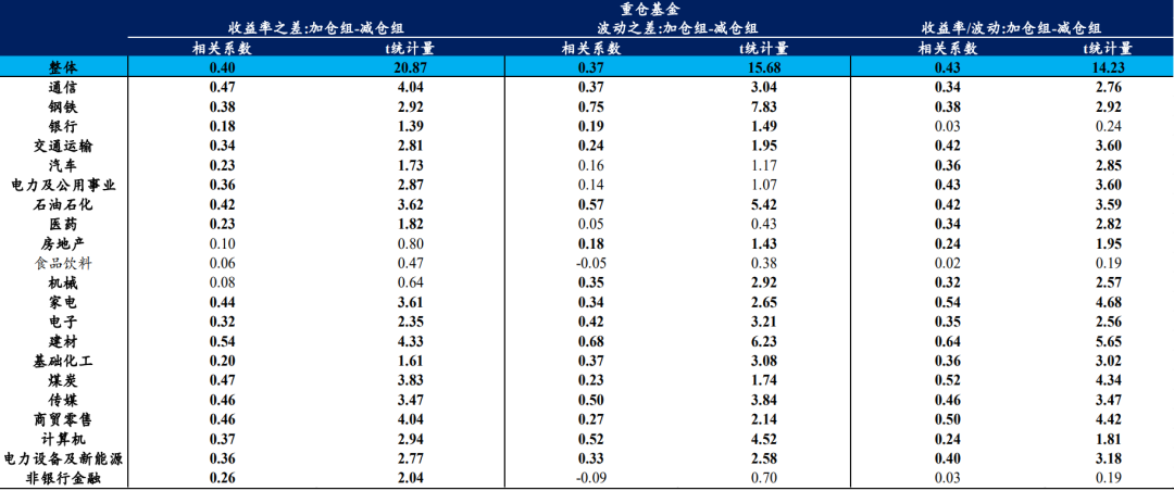 对于绝大多数行业而言,主动基金持有该行业单位波动率下的收益率、持有该行业的收益率相对于行业指数收益率之差等指标与配置方向呈现明显的正向关系