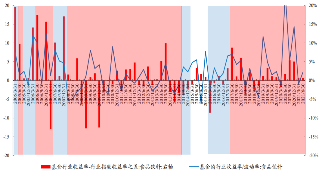对于食品饮料板块而言,在底仓的进入模糊期时,往往基金持有的行业收益率明显高于行业指数收益率,或者基金持有食品饮料的单位波动下的收益率较高,而在底仓的退出模糊期时则往往恰恰相反