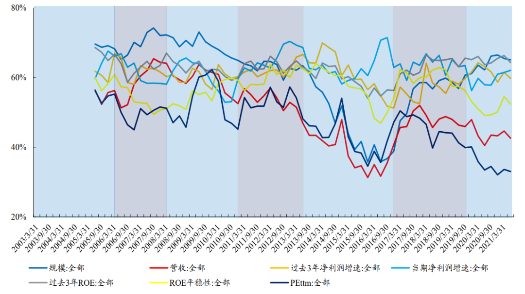 实际上公募对于上述指标的重视程度在不同阶段存在明显差异,且比较的对象不同(全A或沪深300)结果也存在明显差异(由于篇幅有限,具体可见原报告)。