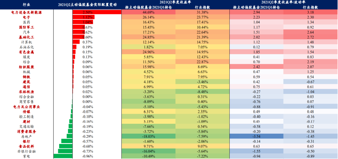对于2021Q2而言,电新、电子、军工、化工、有色、纺织服装、钢铁、建筑、通信、农林牧渔等板块的季度收益率或单位波动收益率强于行业本身且主动偏股基金选择加仓上述行业;电力及公用事业、传媒、建材、消费者服务、银行、食品饮料等板块的季度收益率或单位波动收益率强于行业本身且主动偏股基金选择减仓上述行业