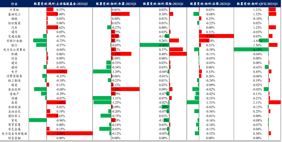 对于2021Q1而言,计算机、化工、钢铁、纺服、汽车、通信、交运、非银、银行、电力及公用事业、机械等板块在被以私募、保险、社保、QFII为代表的绝对收益者广泛定价,而2021Q2公募更多地参与了其中计算机、化工、钢铁、纺服、汽车、通信等板块地定价