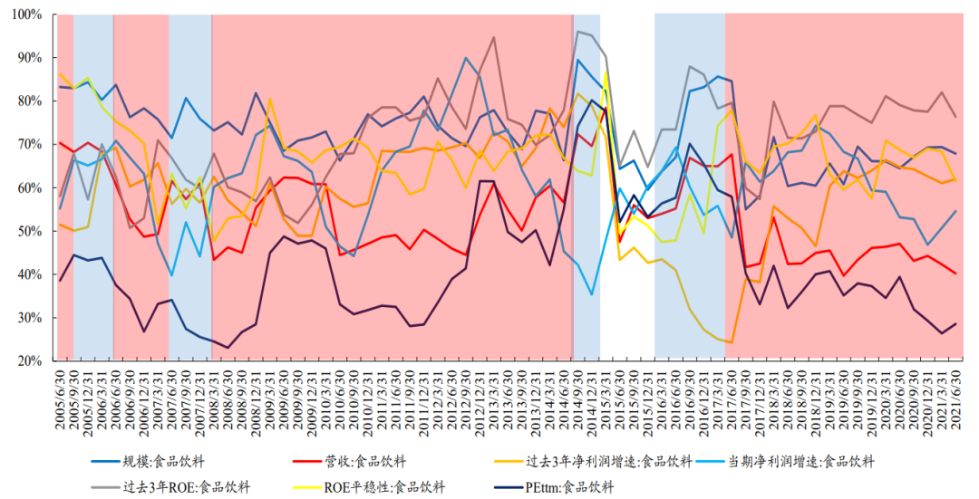 实际上,投资者认知的变迁是多重因素共同作用的结果。我们试图从历年来主动偏股基金前100大重仓股寻找其共识的变迁过程,基于基本面和估值维度,我们共选择了7个指标作为重仓股的表征,即:市值、营收TTM、过去3年净利润复合增速、当期净利润(TTM)增速、过去3年ROE的几何平均、ROE的平稳性(过去3年ROE的变异系数)以及PE(TTM)。我们采用基金重仓股的上述7个指标分别在全A、沪深300样本股中的分位数作为该指标被公募重视程度的度量,其中,估值因素可以理解为对于估值的容忍度,分位数越高(低)表示当前公募对于估值的容忍度越低(高)。