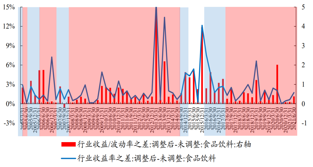 对于食品饮料板块而言,按照调整后的权重计算的当期持有收益率、或单位波动收益率往往高于调整前,且进入模糊期的单位波动收益率往往低于退出模糊期