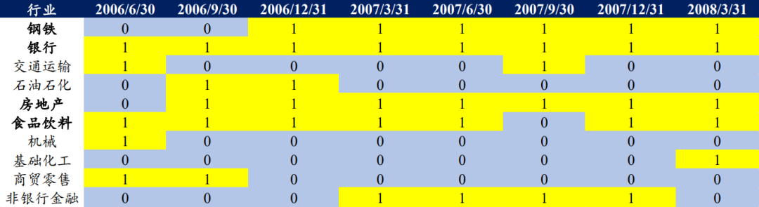 2006Q2-2008Q1期间共有10个行业曾入选主动偏股基金前5大重仓行业,其中银行、地产、食品饮料、钢铁等板块为主动偏股基金在该时期的底仓品种,这意味着公募整体认知相比于上期可能发生了较大的变化。