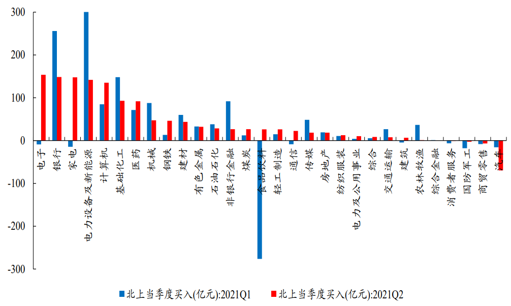 2021Q2北上主要净买入电子、银行、家电、电新、计算机、化工、医药、机械、钢铁、建材、有色等板块