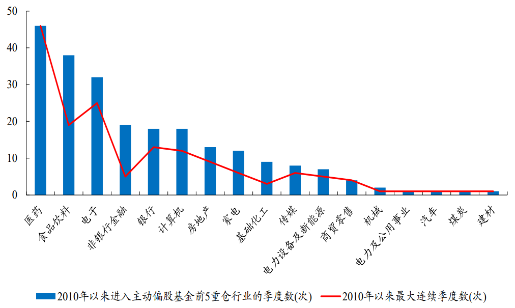 2010年以来,入选主动偏股基金前5重仓行业最多的为医药、食品饮料、电子、非银、银行、计算机等板块,而连续入选次数最多的是医药、电子、食品饮料、银行、计算机等板块