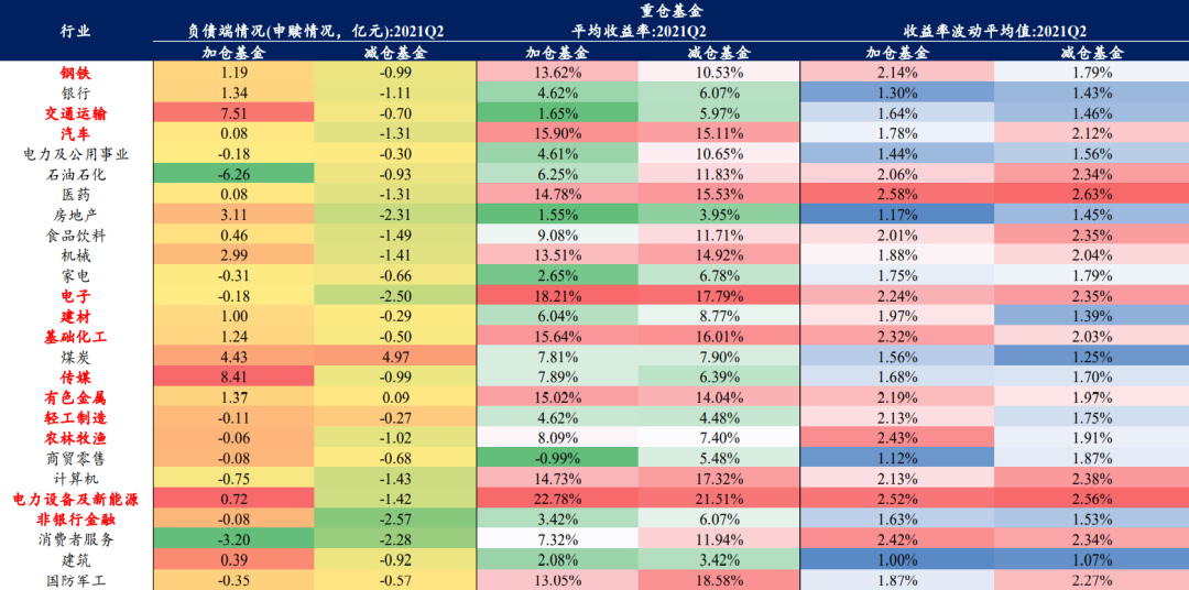 对于2021Q2而言,重仓钢铁、交运、汽车、电子、建材、化工、传媒、有色、轻工制造、农林牧渔、电新、非银等行业的基金中,选择继续加仓该重仓行业的基金表现(收益率或单位波动率下的收益率)明显好于减仓该重仓行业的基金,且收益率为正,同时上述基金明显更加获得基金负债端(个人投资者等)的青睐
