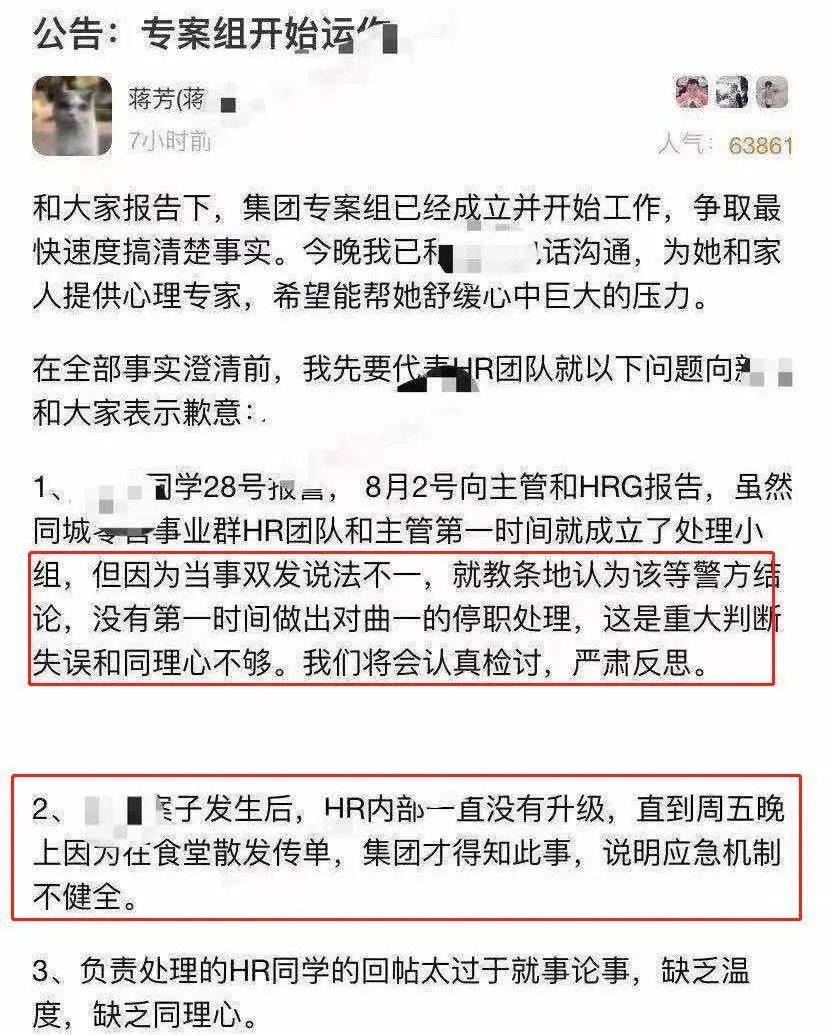 再者,员工出事后要求按照公司规章处置犯错者,仅仅是要求停职、不录用并给自己一段时间休假,但这样简单的诉求并未得到回应。
