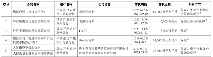 截至 2020年12月31日,阿特斯及其子公司正在履行的金额前五的借款类合同涉及金额共计12.3亿元人民币和12亿美金,涉及金额巨大;短期借款合同包含6.6亿元人民币和7000万美金;借款期限最高至2028年5月,长达15年。