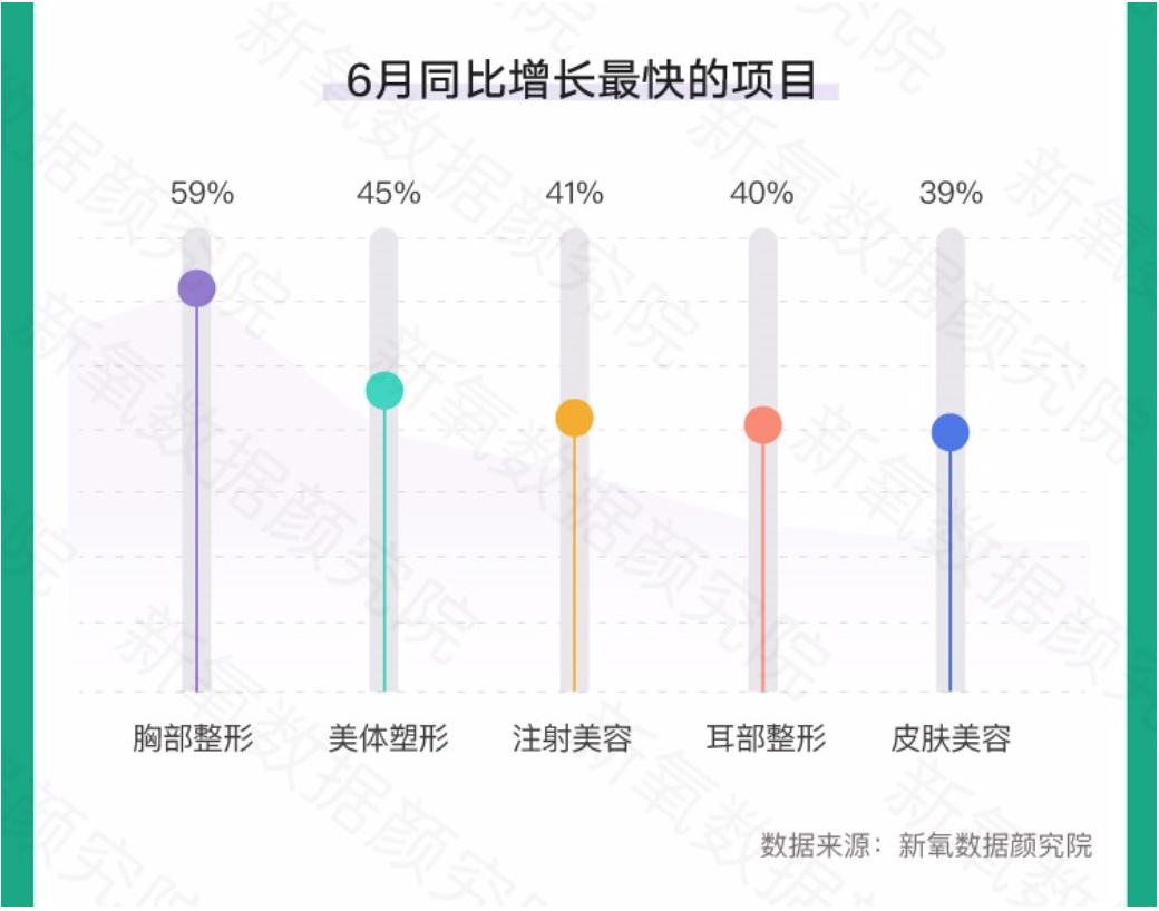 于此同时,胸部整形、美体塑形不仅实现高速的环比增长,更是在去年同期热度较高的基础上,实现同比增长59%、45%,位居6月同比增速前两位。在夏季,对身材的关注成为医美消费的“刚需”。