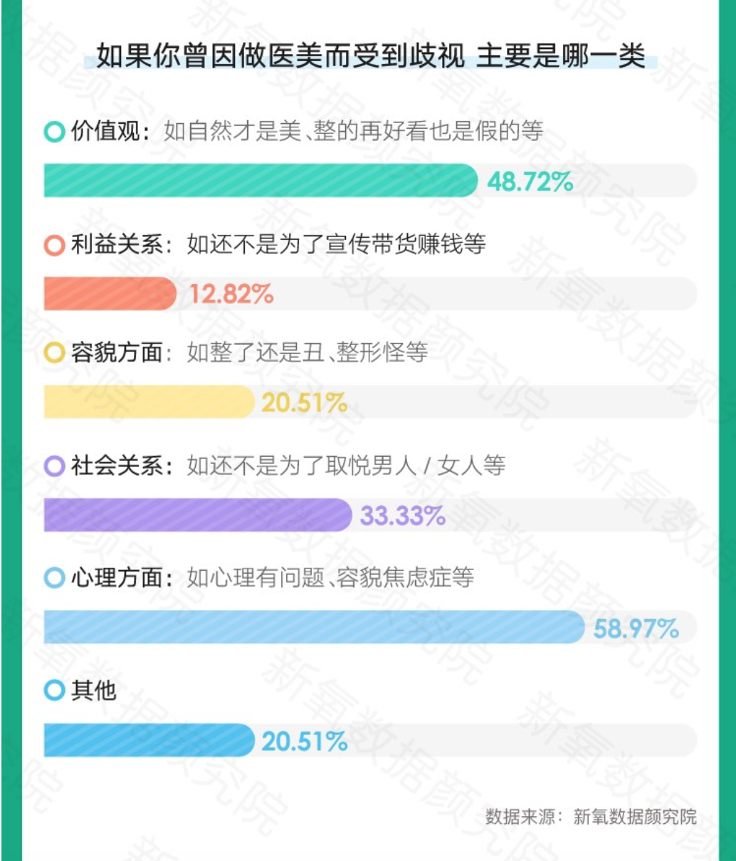 根据新氧体验官今年7月发起的一项面向医美用户的调研问卷显示,有近40%的医美用户,因为做医美而遭受过歧视或非议。