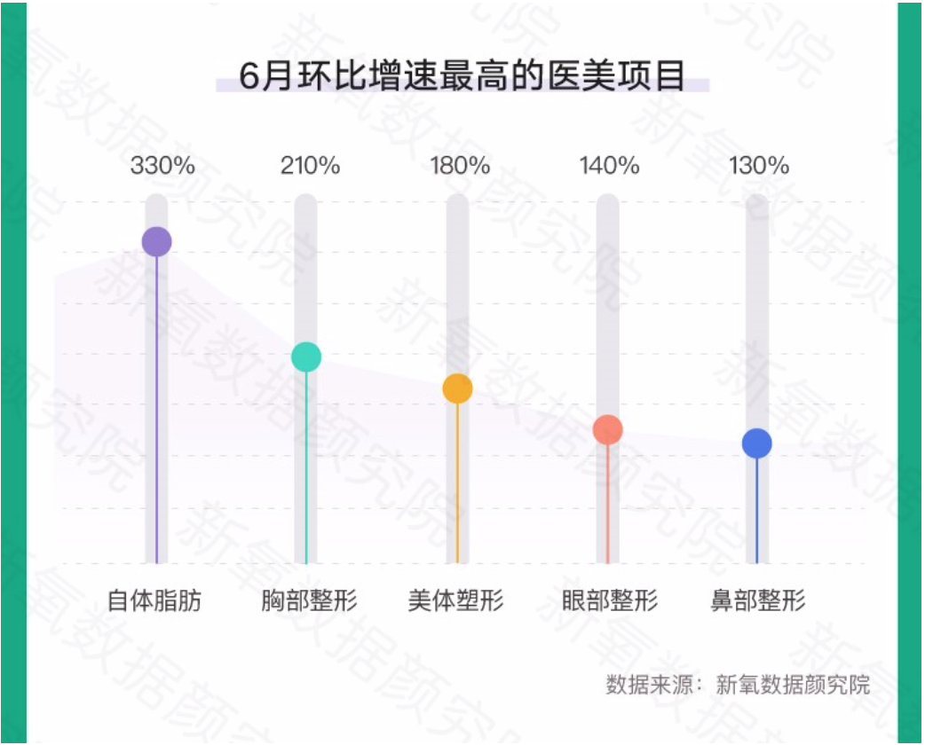 8月10日,新氧数据颜究院发布夏季医美消费趋势,今年6月,医美消费规模环比上涨了87%。自体脂肪填充、胸部整形、美体塑形成为季节性增速最快的项目,6月环比增速高达330%、210%、180%。