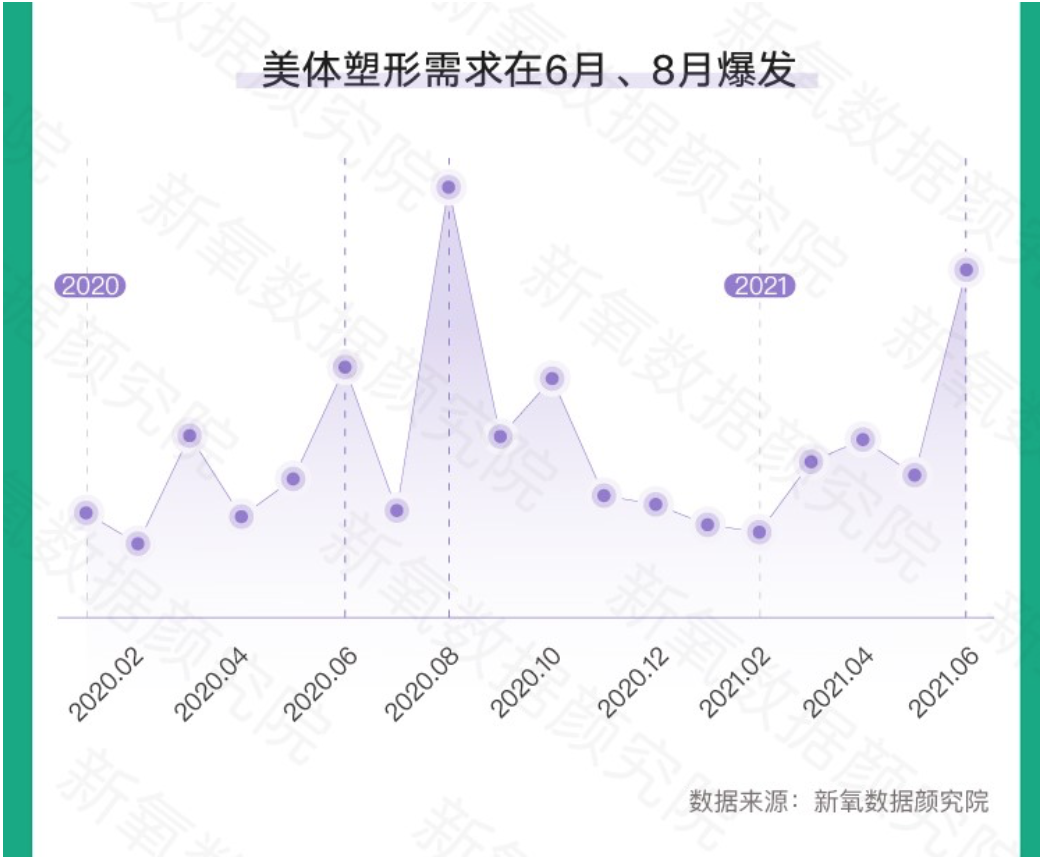 每年暑期前后是医美消费规模增速较快的月份。新氧数据颜究院数据显示,2020年8月,更是创下全年消费体量最高月份,同比2019年增幅超过21%。