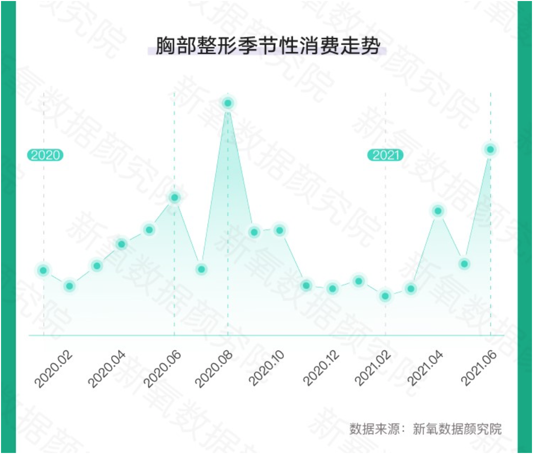 除了瘦身项目以外,暑期也是胸部整形消费增长最快的月份。胸部整形的消费趋势,与瘦身类项目基本维持相同走势。新氧数据颜究院数据显示,2021年6月,胸部整形消费环比增速超过210%,同比增速超过59%。