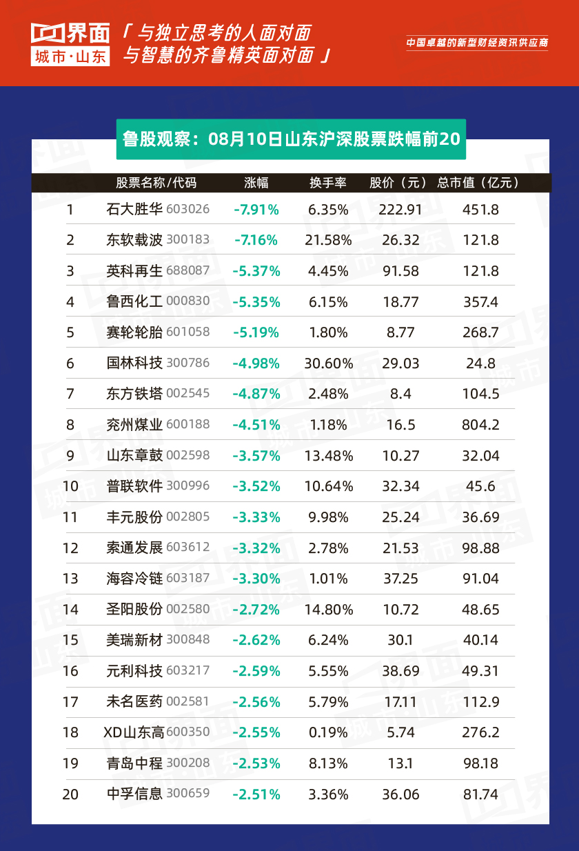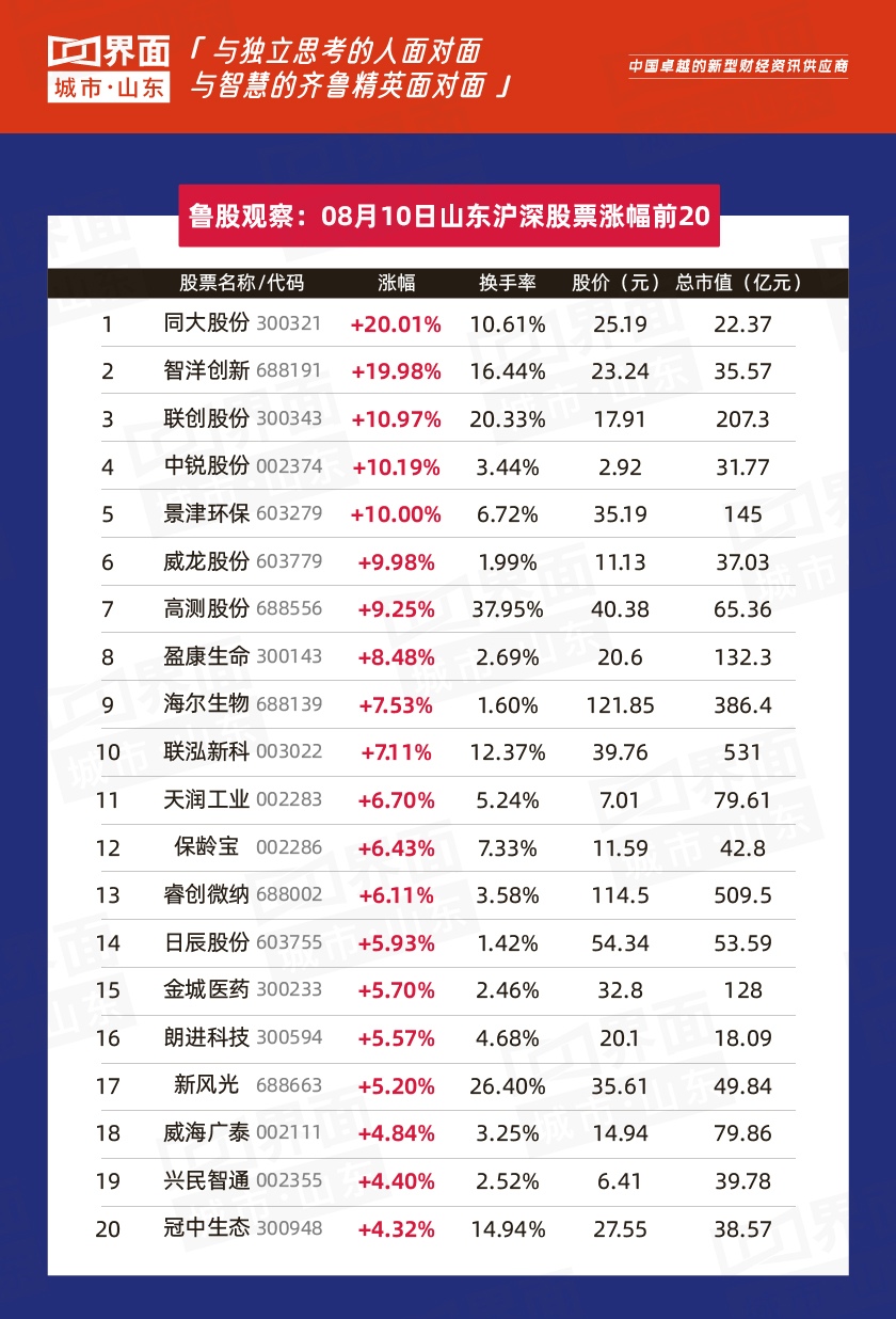 8月10日,山东157股上涨,79股下跌,14股持平。