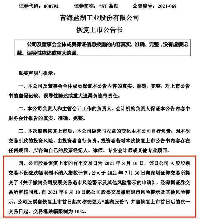 7月31日,暂停上市15个月后,*ST盐湖发布公告,让持有股票的57227户股东欢呼雀跃。公告称,*ST盐湖收到深交所通知,公司股票将于8月10日在深交所恢复交易,同时,公司向深交所提交了撤销公司股票交易退市风险警示及其他风险警示的书面申请,待交易所核准后,公司股票简称由*ST盐湖变更为盐湖股份。