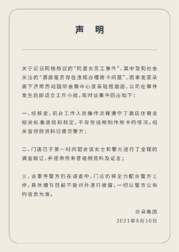 8月10日晚间,@亚朵ATOUR 就“阿里女员工事件”中受到社会关注的“酒店是否存在违规办理房卡问题”发表回应称,经核查,前台工作人员操作流程遵守酒店住宿业相关标准流程和规定,不存在违规制作房卡的情况,相关音视频资料已提交警方;门店已于第一时间配合该女士和警方进行了全程的调查取证,并提供所有音视频资料及证言;该事件警方仍在调查中,门店仍将全力配合警方工作,具体细节目前不能对外进行披露,一切以警方公布的信息为准。