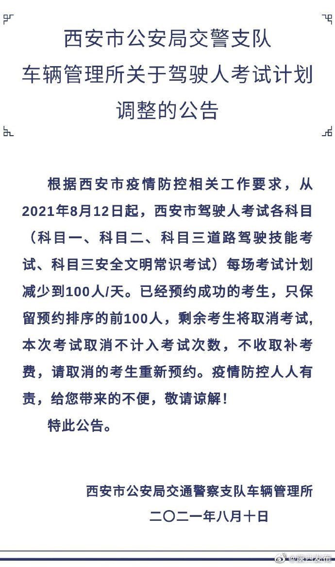 据@陕西发布 消息,根据西安市疫情防控相关工作要求,从2021年的8月12日起,西安市驾驶人考试各科目(科目一、科目二、科目三道路驾驶技能考试、科目三安全文明常识考试)每场考试计划减少到100人/天。已经预约成功的考生,只保留预约排序的前100人,剩余考生将取消考试,本次考试取消不计入考试次数,不收取补考费,请取消的考生重新预约。