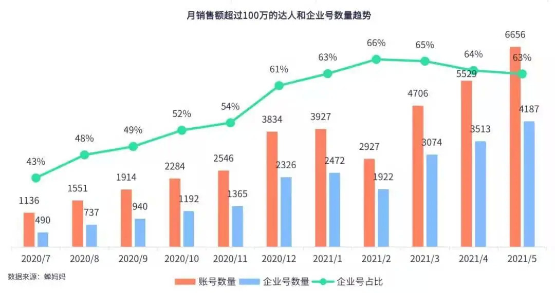 不可否认,品牌自播已经趋于常态化和稳定化,截止2021年5月,蝉妈妈数据显示,品牌自播已于达人主播趋于平衡,其中5月抖音企业号用户数占比为63%。