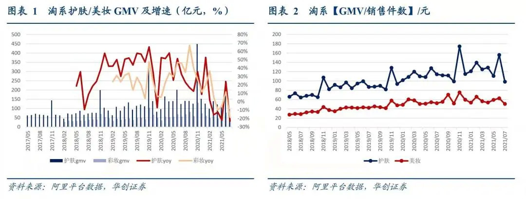 不难发现,在阿里电商平台,护肤7月销售略高于彩妆,但从增速上来看,二者较上个月都有回落。