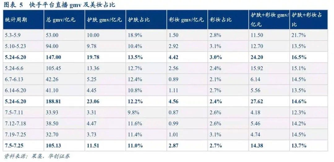 从各大平台的直播数据来看,护肤和彩妆在直播带货上的表现尚可。据果集数据显示(7.5-7.25期间),抖音平台实现护肤、彩妆直播GMV各实现21.54亿元、6.32亿元;快手平台护肤和彩妆实现直播GMV分别为11.51亿元、2.87亿元。