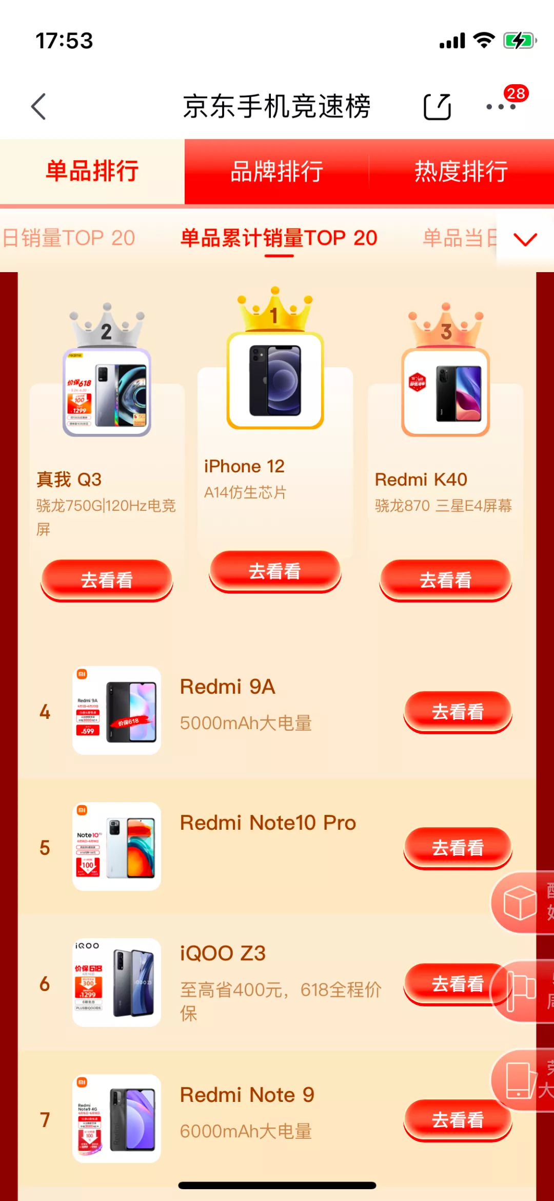 根据京东的618销量数据统计,销量最高的手机型号还是iPhone 12,一款高端手机抢占了手机整体销量榜首。余下的皆为小米和OPPO的低端子品牌,比如小米旗下的Redmi和OPPO旗下的Realme,以及vivo旗下的IQOO。