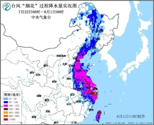 而“烟花”给人们带来的损失,也与烟花在节庆时助兴的作用截然相反。缓慢移动的台风“烟花”积攒了大量的水汽,体态庞大,风雨影响范围广阔。期间,我国台湾、浙江、上海、山东等14个省(市)均受到影响,19个国家气象站日降雨量突破7月历史极值。