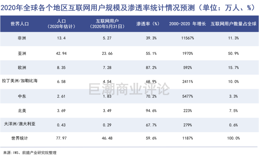 东南亚是全球互联网用户增长的缩影。根据前瞻产业研究院的数据,截至2020年6月(5月31日),全球互联网用户数量达到46.48亿人,占世界人口的比重为59.6%。