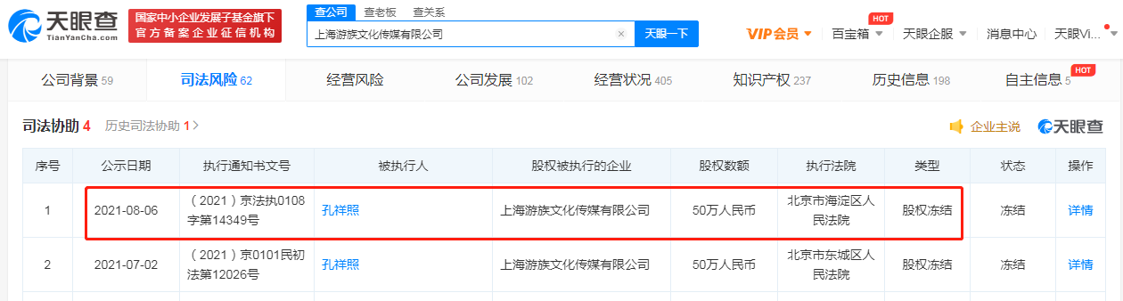 据天眼查APP显示,近日,游族影业关联公司上海游族文化传媒有限公司新增股权冻结信息。被执行人为孔祥照,股权数额为50万人民币,冻结期限至2024年8月5日。执行法院为北京市海淀区人民法院。股东信息显示,该公司股东包括上海奇歆咏岩投资有限公司、林奇、孔祥照、刘慈欣等。