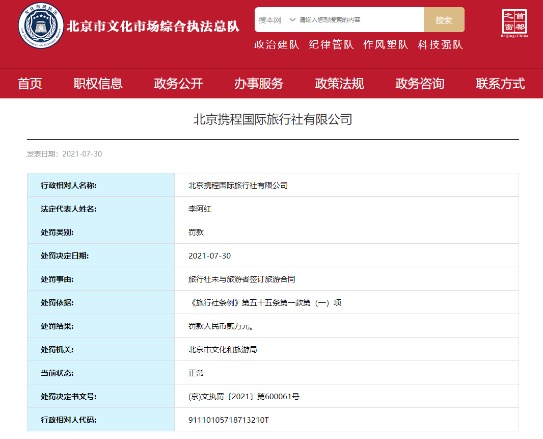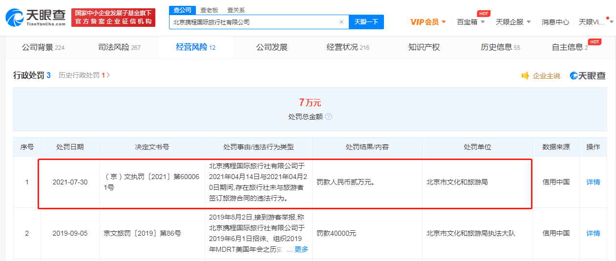 据天眼查APP显示,近日,北京携程国际旅行社有限公司新增行政处罚,处罚事由为存在旅行社未与旅游者签订旅游合同的违法行为,处罚结果为罚款2万元。处罚单位为北京市文化和旅游局。此前该公司也曾因未签订旅游合同、安排不具备领队条件的人员提供领队服务被处罚。