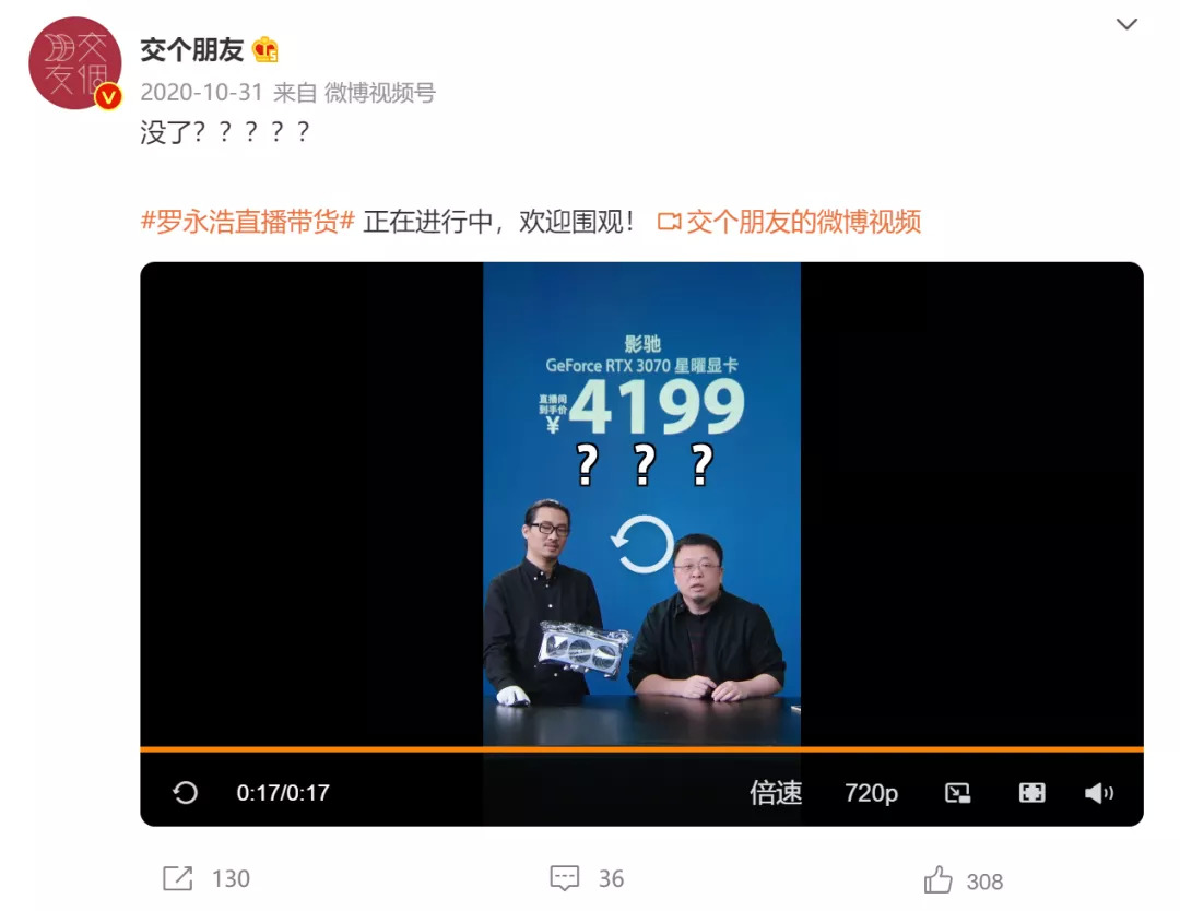 2020年10月,罗永浩直播间上架了影驰RTX 3070星曜显卡,在其还没完成产品介绍时,产品便已被抢光。今年以来,已有影驰3070显卡、华硕3090显卡、微星电竞主板等产品出现在罗永浩的直播间。