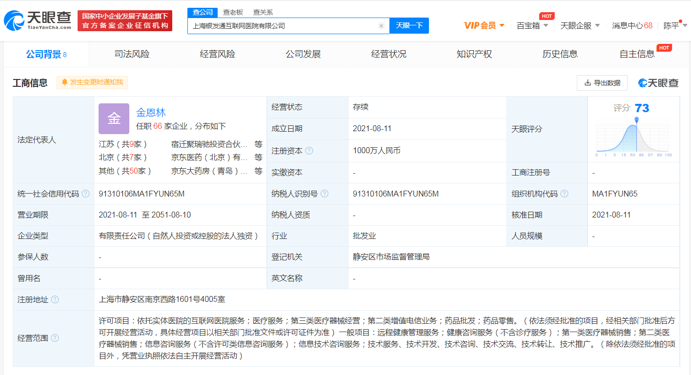 据天眼查APP显示,8月11日,上海银发通互联网医院有限公司成立,法定代表人为金恩林,注册资本1000万人民币,经营范围包括依托实体医院的互联网医院服务;医疗服务;远程健康管理服务;健康咨询服务等。股东信息显示,该公司由寿眉康(上海)互联网医院有限公司全资控股,后者由宿迁京东天宁健康科技有限公司、冯艳辉共同持股。