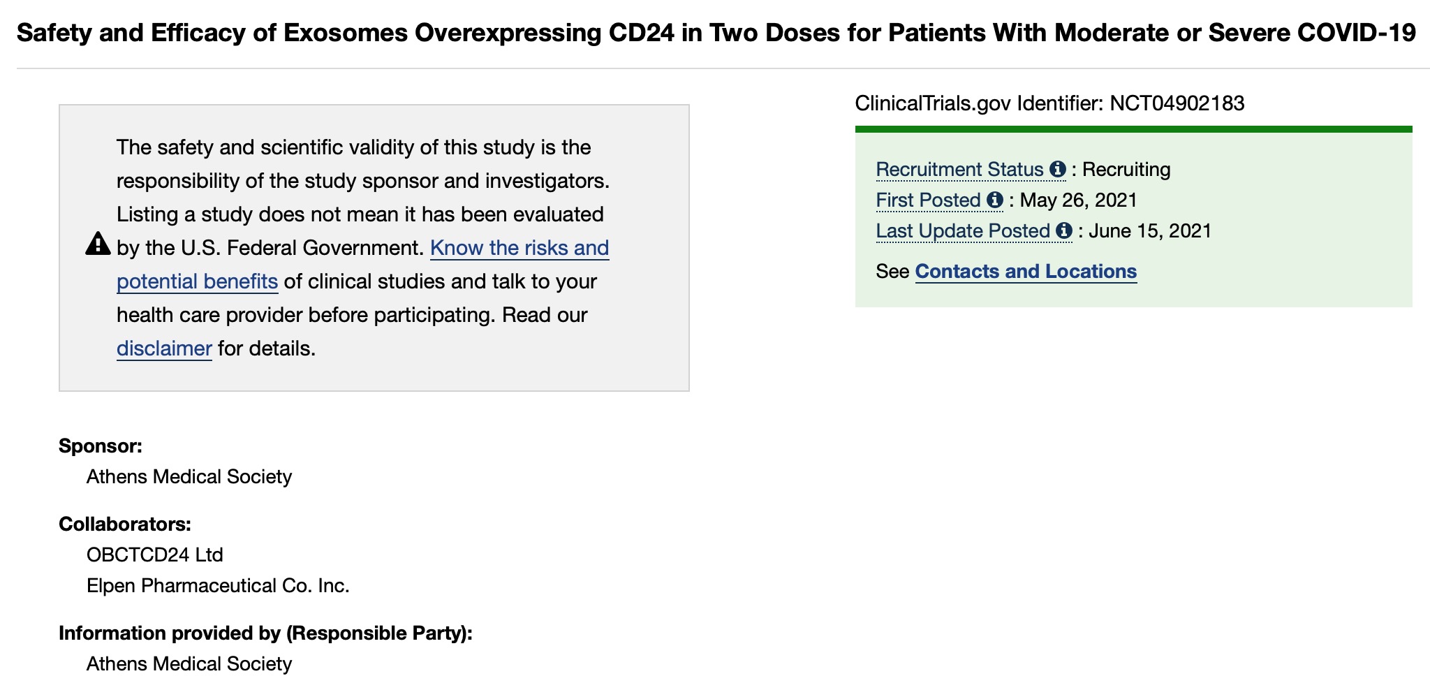 《耶路撒冷邮报》近日报道的取得了积极成果的2期临床研究主要在希腊的研究中心进行,对照临床试验注册登记信息可知,应该为所登记的“评估两种剂量EXO-CD24在中至重度新冠病毒患者中的安全性和有效性”这项研究。