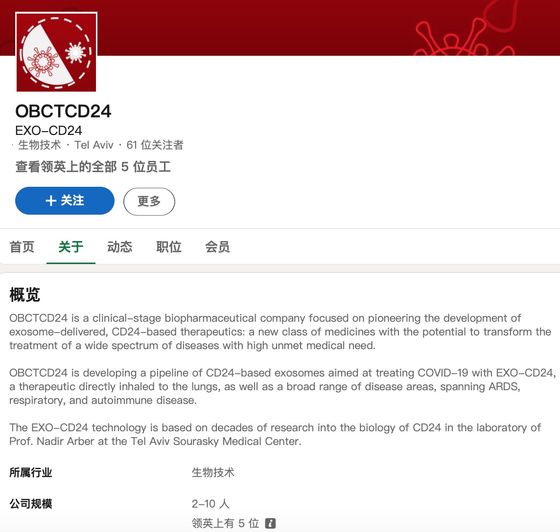 界面新闻记者还从上述临床试验登记中发现,研发“EXO-CD24”的企业名为“OBCTCD24”。记者未能检索出该公司官网,而职场社交平台领英显示,OBCTCD24是一家处于临床阶段的生物制药公司,其正在开发一系列基于CD24的外泌体的药物,这是一种直接吸入肺部的治疗药物,旨在用外泌体CD24治疗新冠病毒以及于ARDS、呼吸系统疾病和自身免疫性疾病等广泛疾病领域。EXO-CD24技术基于特拉维夫苏拉斯基医学中心纳迪尔·阿尔伯教授实验室数十年来对CD24生物学的研究。