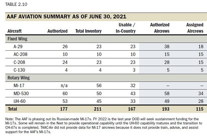 阿富汗重建特别监察长办公室报告指出,由于火力支援、侦查、巡逻、情报、运输等需求激增,阿空军的所有飞机都在超负荷运作。