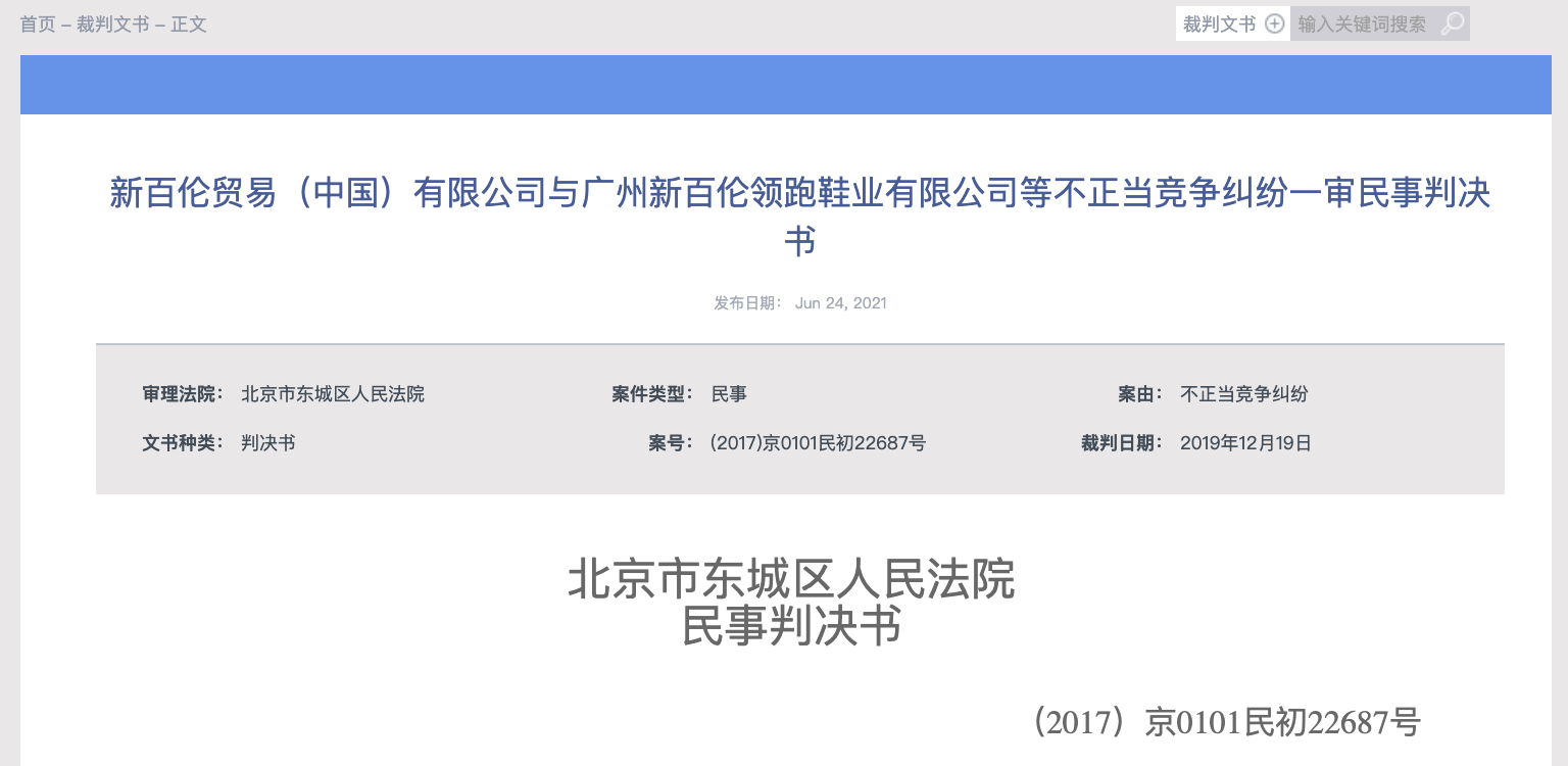 据天眼查APP显示,近日,北京法院审判信息网公开新百伦贸易(中国)有限公司与广州新百伦领跑鞋业有限公司等不正当竞争纠纷一审民事判决书,案号(2017)京0101民初22687号,审理法院为北京市东城区人民法院。