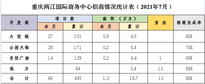 近日,位于中央公园的两江国际商务中心最新招商率曝光,截至今年7月,两江国际商务中心整体招商率完成56%,其中公园天街的招商率更是达到70%,已累计完成171个招商项目,吸引多家知名品牌入驻。