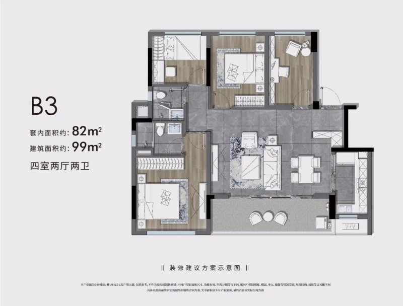 大面宽餐客厅,高度满足居者宴请好友、家庭聚会等生活需求;集豪华主卧、步入式衣帽间、双台盆卫生间、私享咖啡露台于一体的四合一套房式主卧,则更显私密和尊崇。