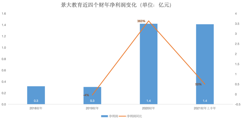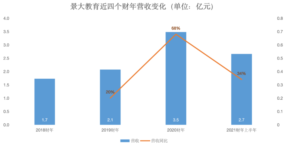 近四个财年,景大教育的营收处于稳步增长阶段,2019财年,营收2.1亿元,同比增长20%。即使受疫情影响的2020年,仍然呈现逆向增长。2020财年,营收3.5亿元,同比增长68%;2021财年上半年,营收2.7亿元,同比增长34%。