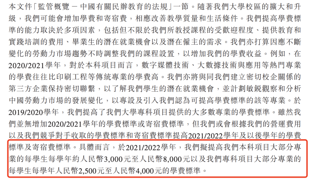 对此,景大教育还表示,2021/2022学年,将继续提高本科项目大部分专业的学费3000元至8000元,提高专科项目的大部分专业的学费标准2500元至4000元。